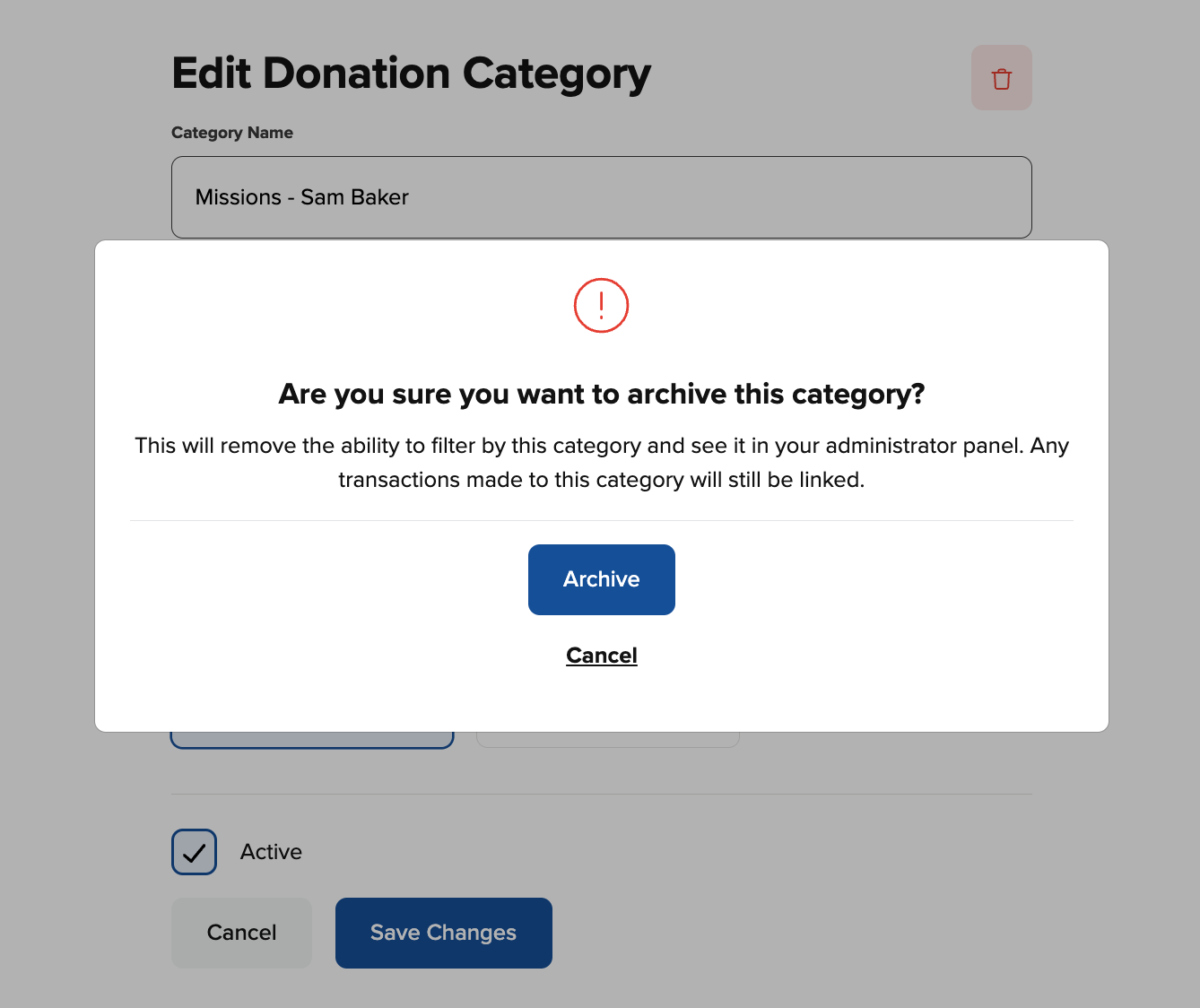 After clicking on the trash can, you will be asked to confirm your desire to archive the category.