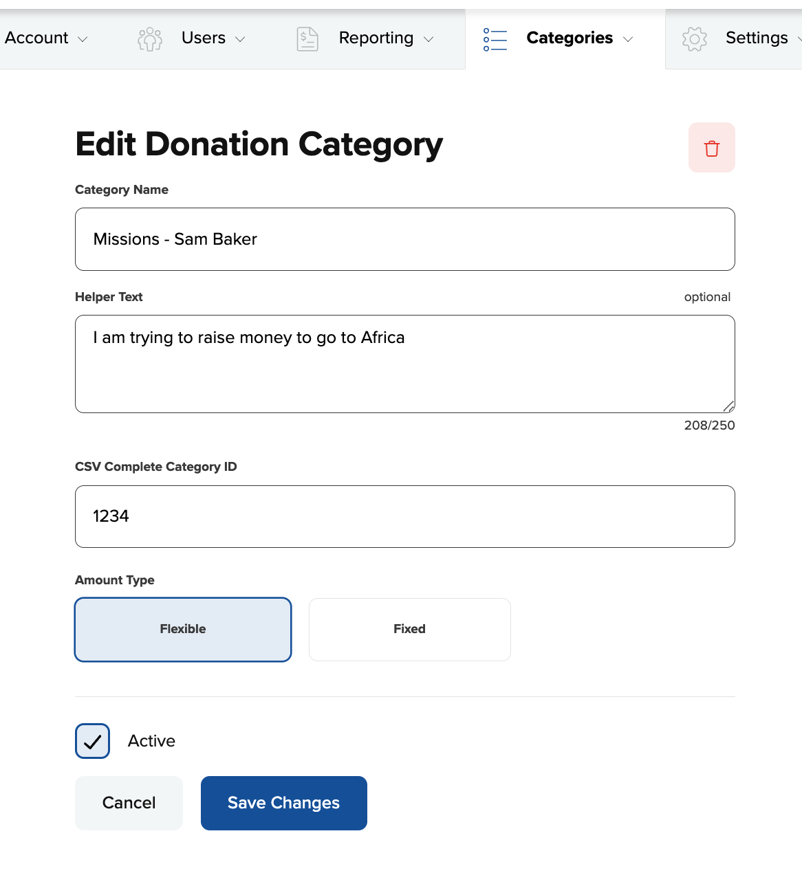 Archiving a category will allow you to remove it from your list of All Categories. To archive a category, go to Categories>Donations or Categories>Purchases and click on the Edit pencil of the one you want to archive. You will now see a trashcan icon to the upper right.  *Please note that you will lose the ability to filter by categories that have been archived. If you just need to keep donors from seeing a category when donating but you still need it for reporting, it is best to just hide the category using the toggle on the categories list. (see Help Center article for Displaying or Hiding Categories)