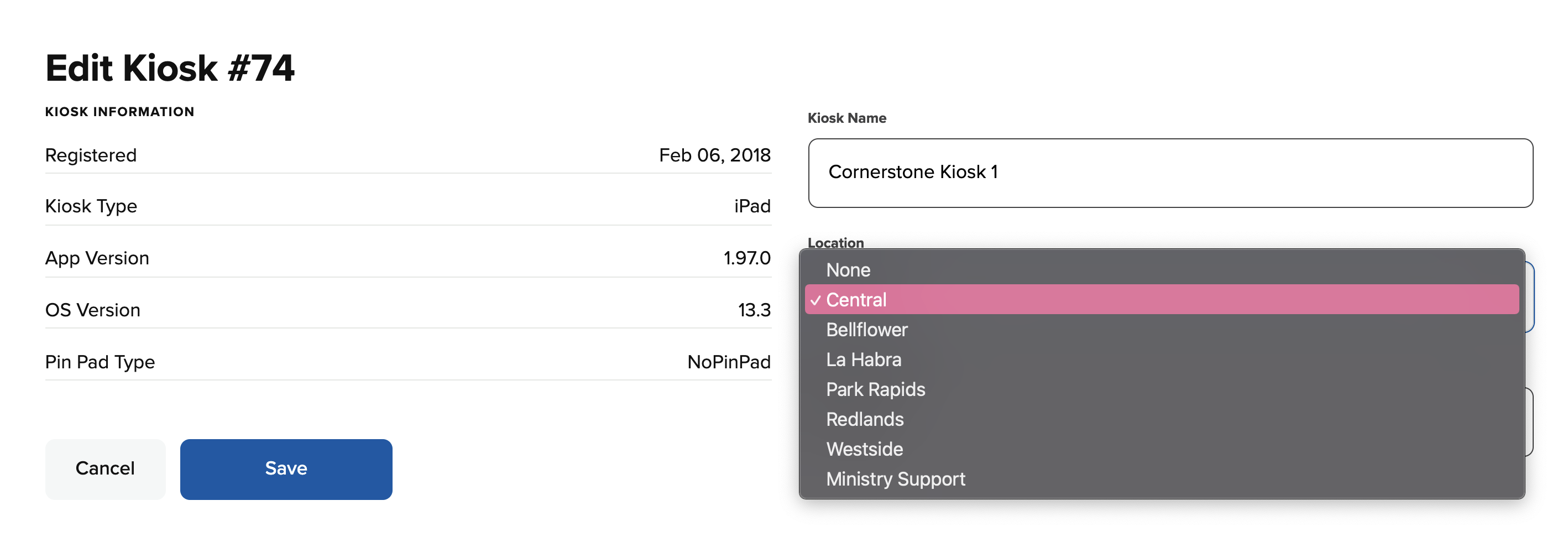 A kiosk is not assigned to a particular location by default. Therefore, if your organization has multiple locations, they will all appear on the kiosk on a pre-donation selection page. In order to get rid of the location selection page, you will need to assign the kiosk to the location. To do so, follow the instructions below.