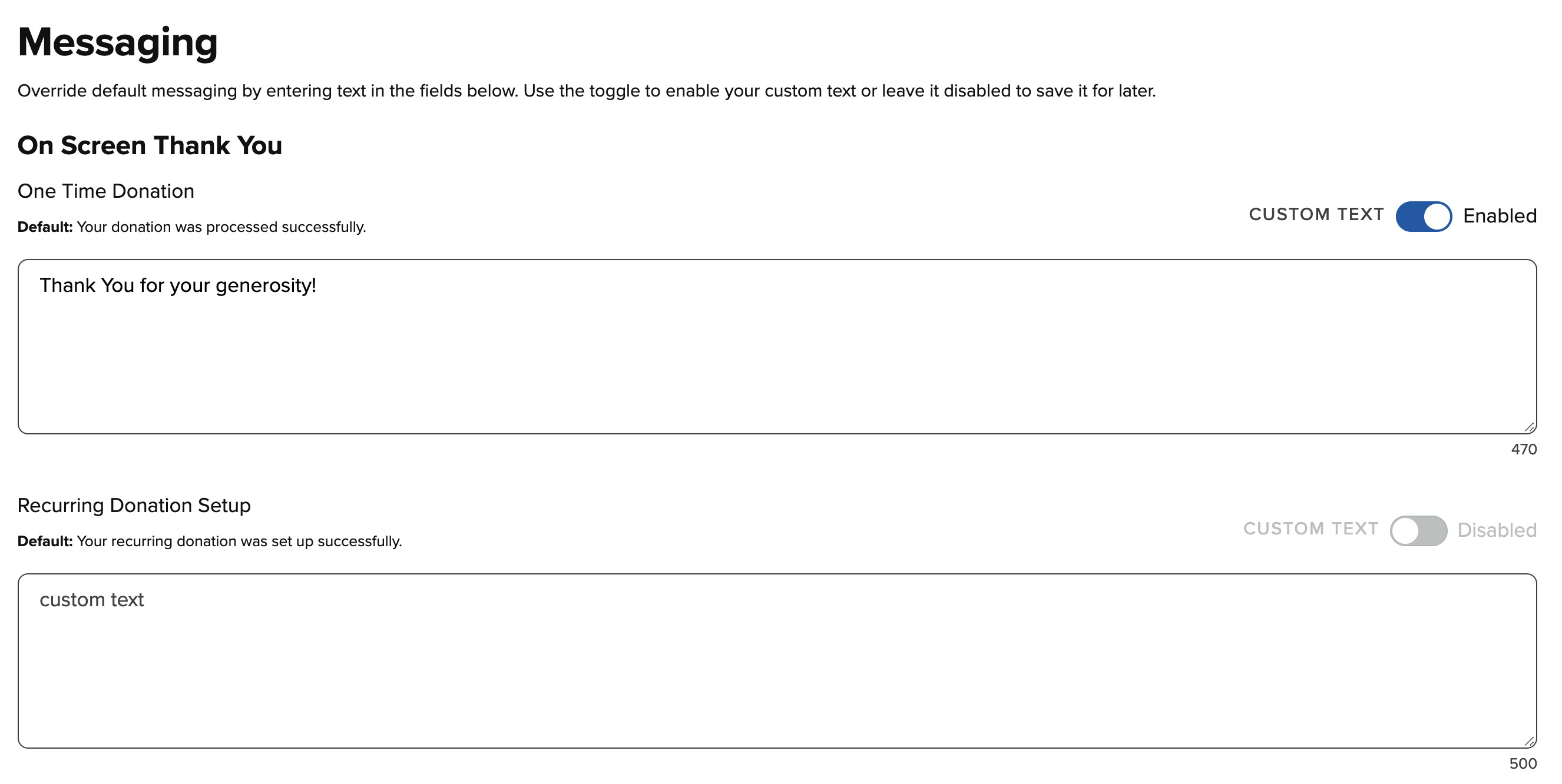 You can set up custom On-Screen Messages, Email Receipts, and Printed Receipts on the Messaging page under Settings. You will use the boxes to type in your custom message and then activate them using the Enable toggle. Remember to select "Save" at the bottom of the page in order to save any changes you have made.