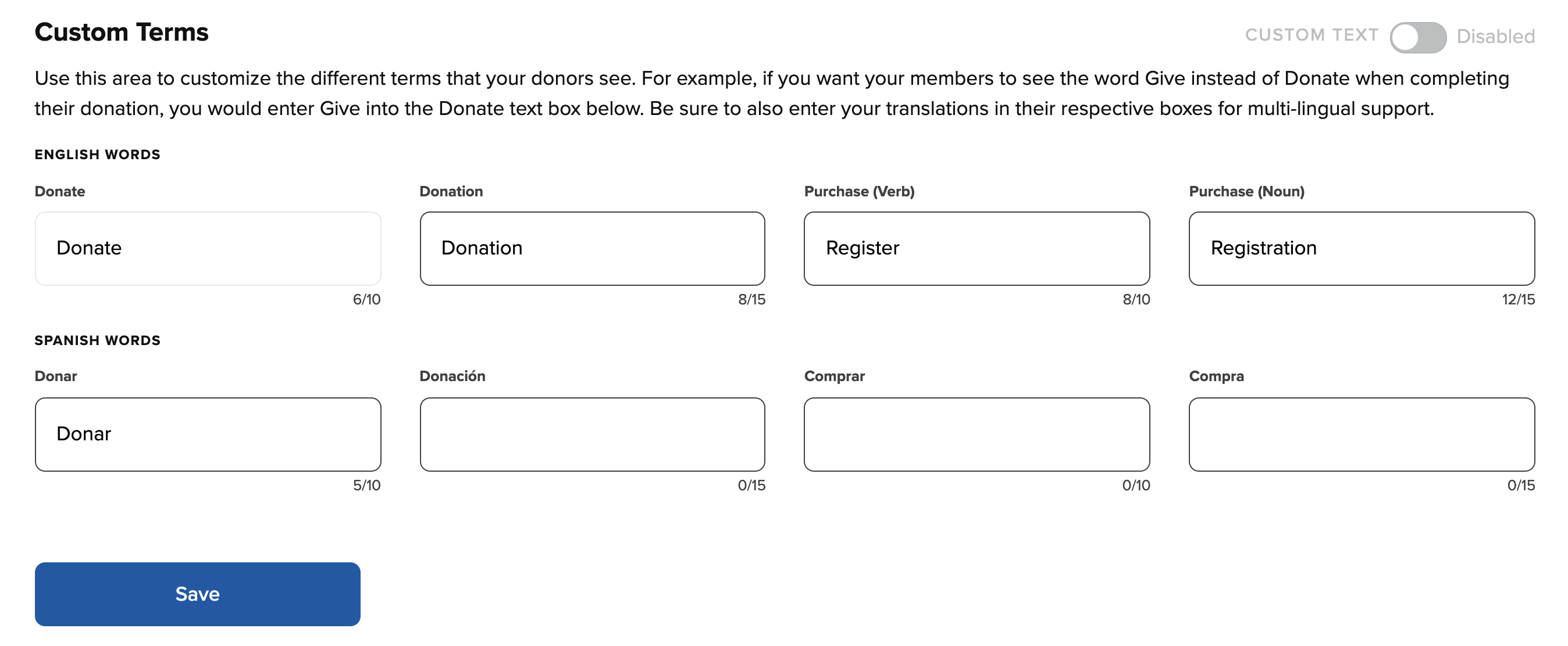 Also, at the Custom Terms section, you have the ability to customize text for the Donate and Purchase buttons on your online, kiosk, and mobile giving pages. Once you have created your customized text, you can activate them by using the Enable toggle. Remember to select “Save” at the bottom of the page in order to save any changes you have made.