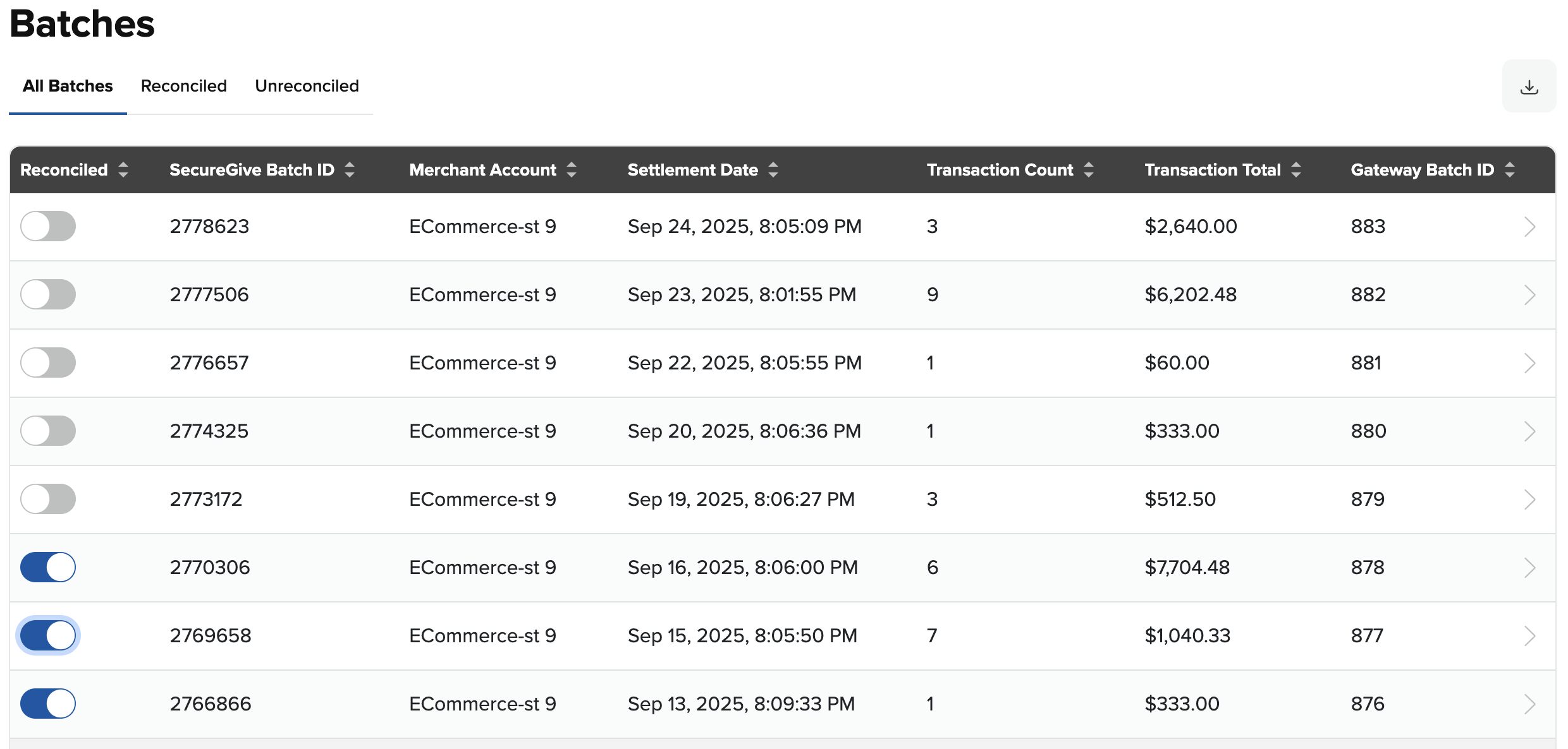 We've also included a toggle under the Reconciled column that allows you to easily mark which batches you have reconciled in your records. By clicking the Reconciled tab, you'll only see the batches that you have marked as reconciled, or click the Unreconciled tab to only see the batches that still need to be reconciled. You can then click the All Batches tab to view all batches again.