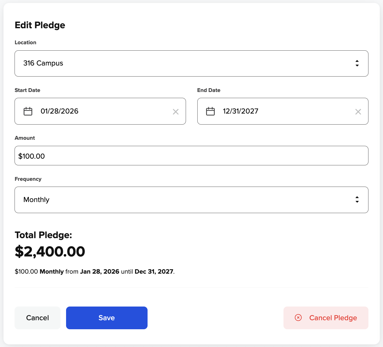 - From the Edit Pledge page, you can edit the Location, Start Date, End Date, Amount, and Frequency.