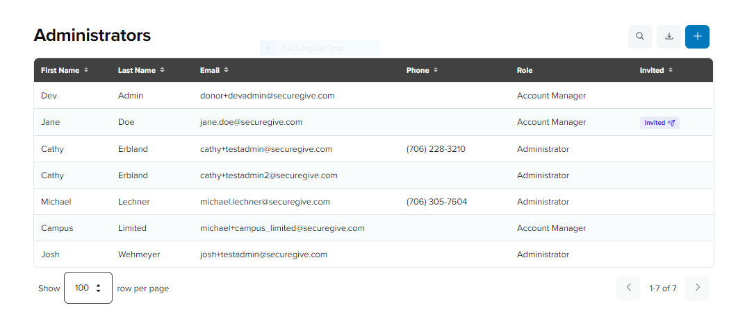 2. You will see the list of administrators that have been created in your dashboard. This list will indicate names, emails, and roles of the administrators and will also display an Invited badge if they have been invited to be an administrator but have not accessed it yet.