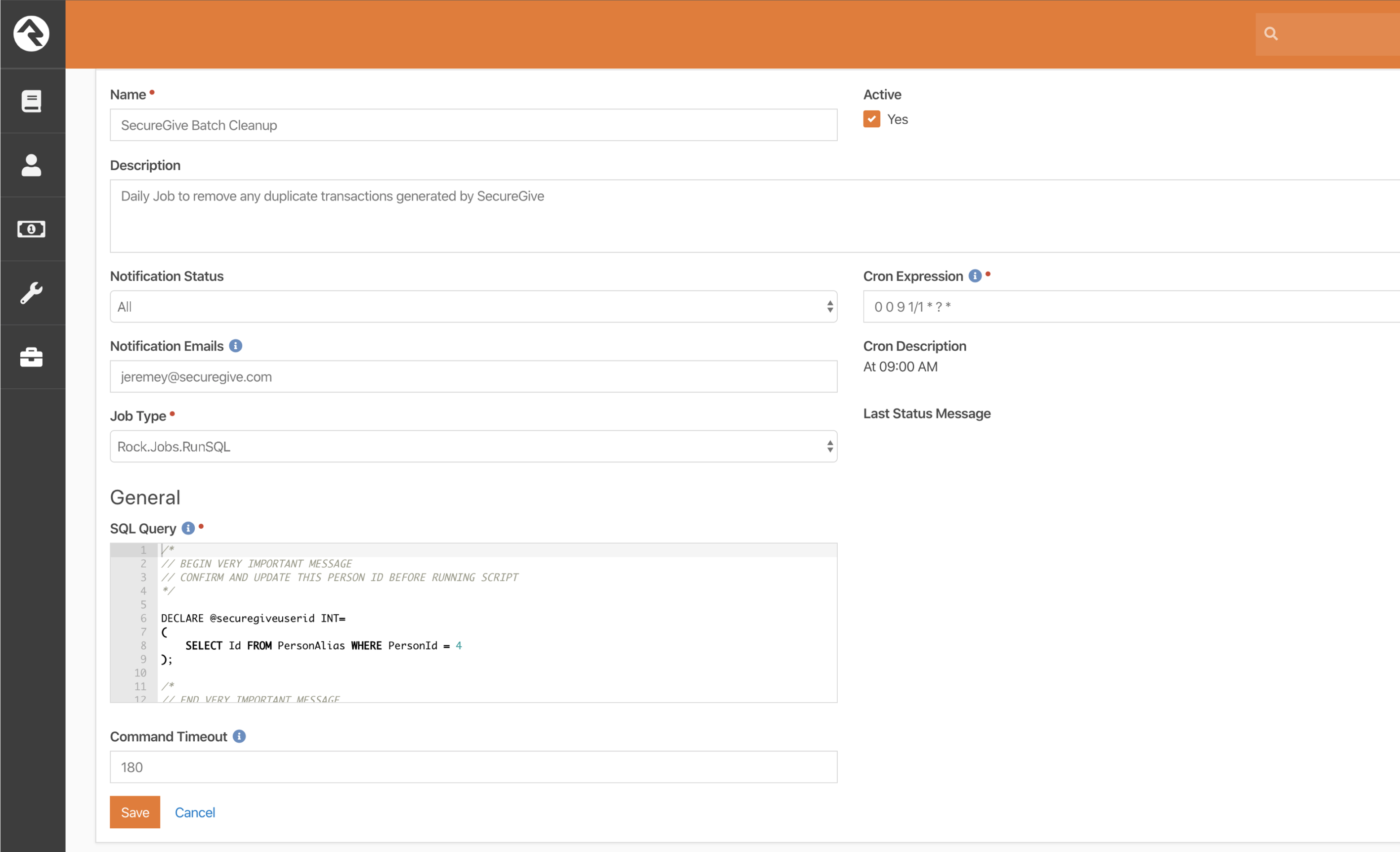Once you have the correct ID for the SecureGive REST User, you can configure the scheduled job to cleanup duplicate transactions. To do this: