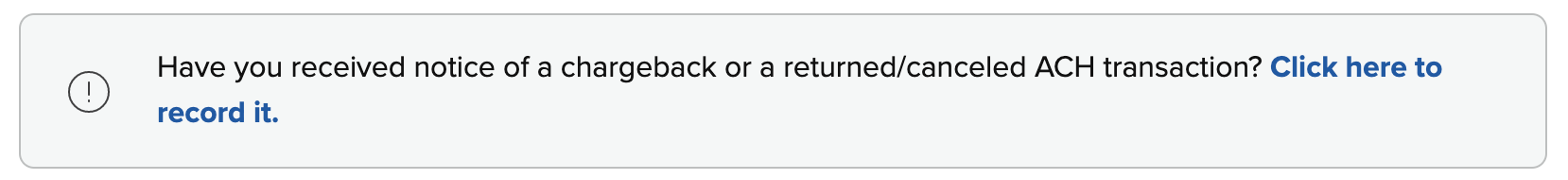 3. Take notice of the gray section at the top of the Edit Transaction screen where it says "Have you received notice of a chargeback or returned/canceled ACH transaction?" Click where it says, "Click Here to Record It."