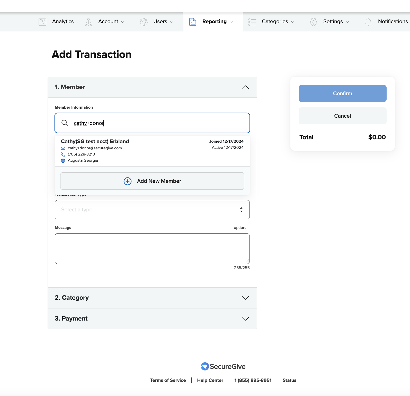 - Enter a name or email address in the Member blank to see if the donor already exists in your database. If they do, click on the appropriate result. If they do not, you can click Add Member to enter them (only if completing a one time donation). If the donor doesn't have a registered account in SecureGive, you will not be able to set up a recurring donation for them.