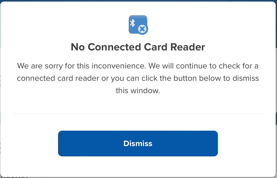 When the iPad SecureGive kiosk app is first launched, you'll see the pop-up message below while the iPad is searching and connecting with the VP3300 card reader. Once the iPad connects with the card reader, the pop-up message will disappear on its own after a few seconds. However, if the pop-up message does not go away on its own, or if it repeatedly appears during a giving session, that can point to either the card reader not getting power or needing to be reset. Please follow the steps below to troubleshoot: